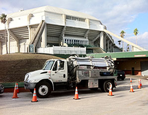 Our septic pumping truck is in front of USF Sun Dome, one of our loyal septic cleaning customers who uses us for septic pumping, lift station cleaning, storm drain cleaning, and general plumbing services Tampa.